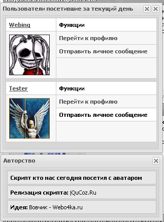 Как и обычно, хорошие идеи насчет уникальных скриптов, сегодня как раз такая попалась, и я ее в этот же день реализовал, скрипт выводит последних посетивших людей за сегодня с аватаром, кроме аватара я добавил еще пару функции "Отправить личное сообщение" и "Профиль пользователя".