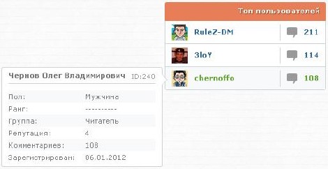 Всем доброго дня, сегодня мы будем создавать информер топ пользователей по комментариям uCoz, при наведении на которые появляется дополнительная информация о пользователе и всё на css